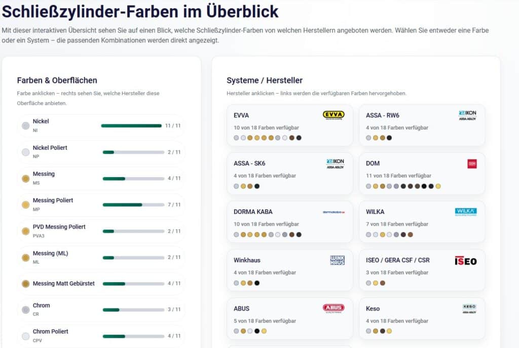 👉 Übersicht aller Farben und Oberflächen für Schließzylinder: